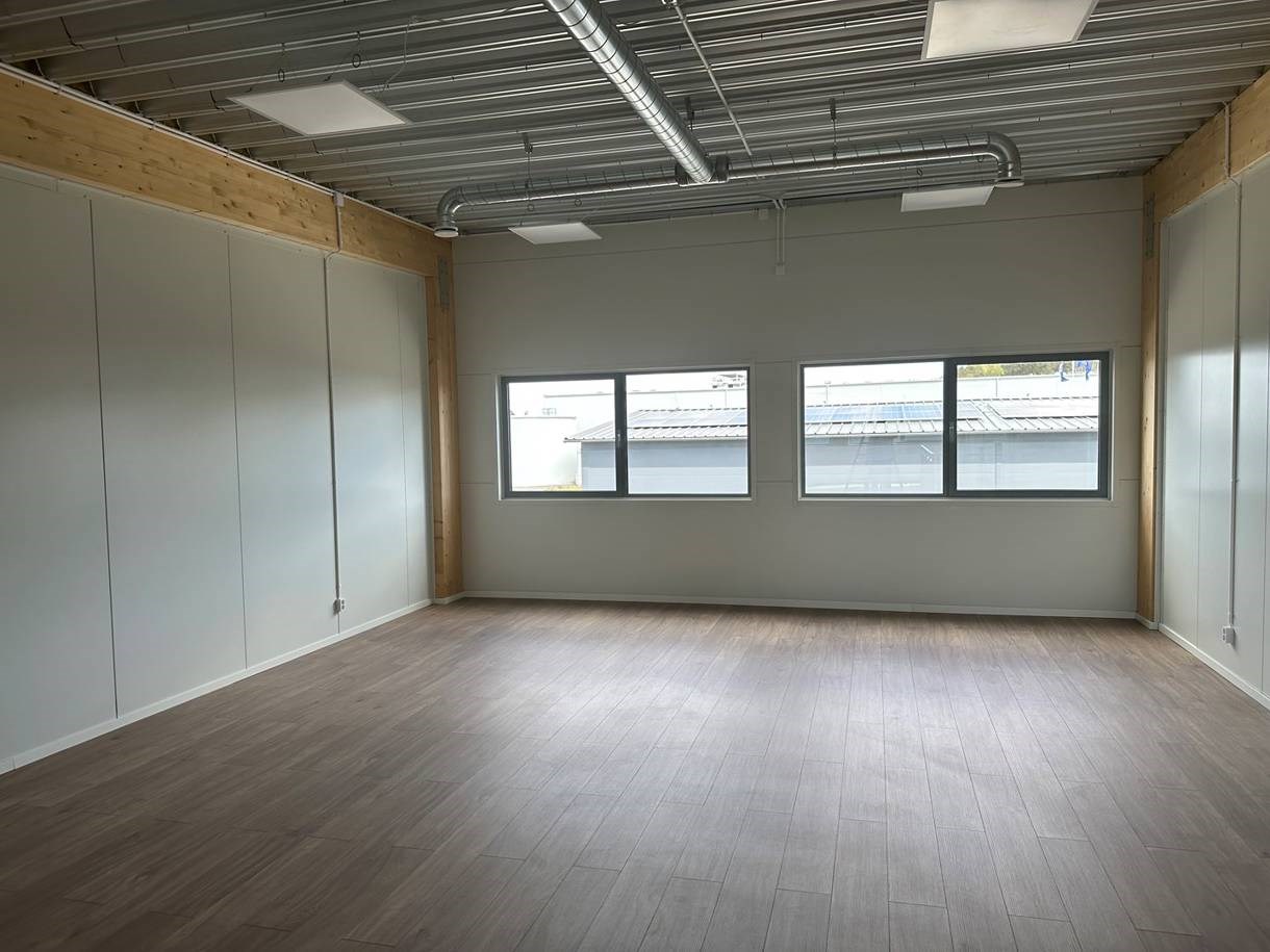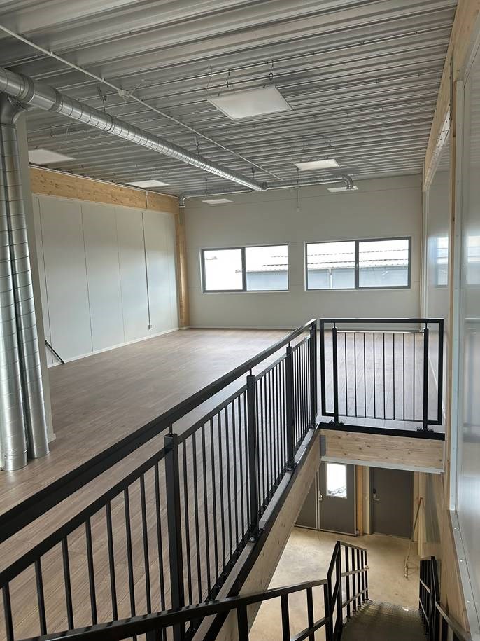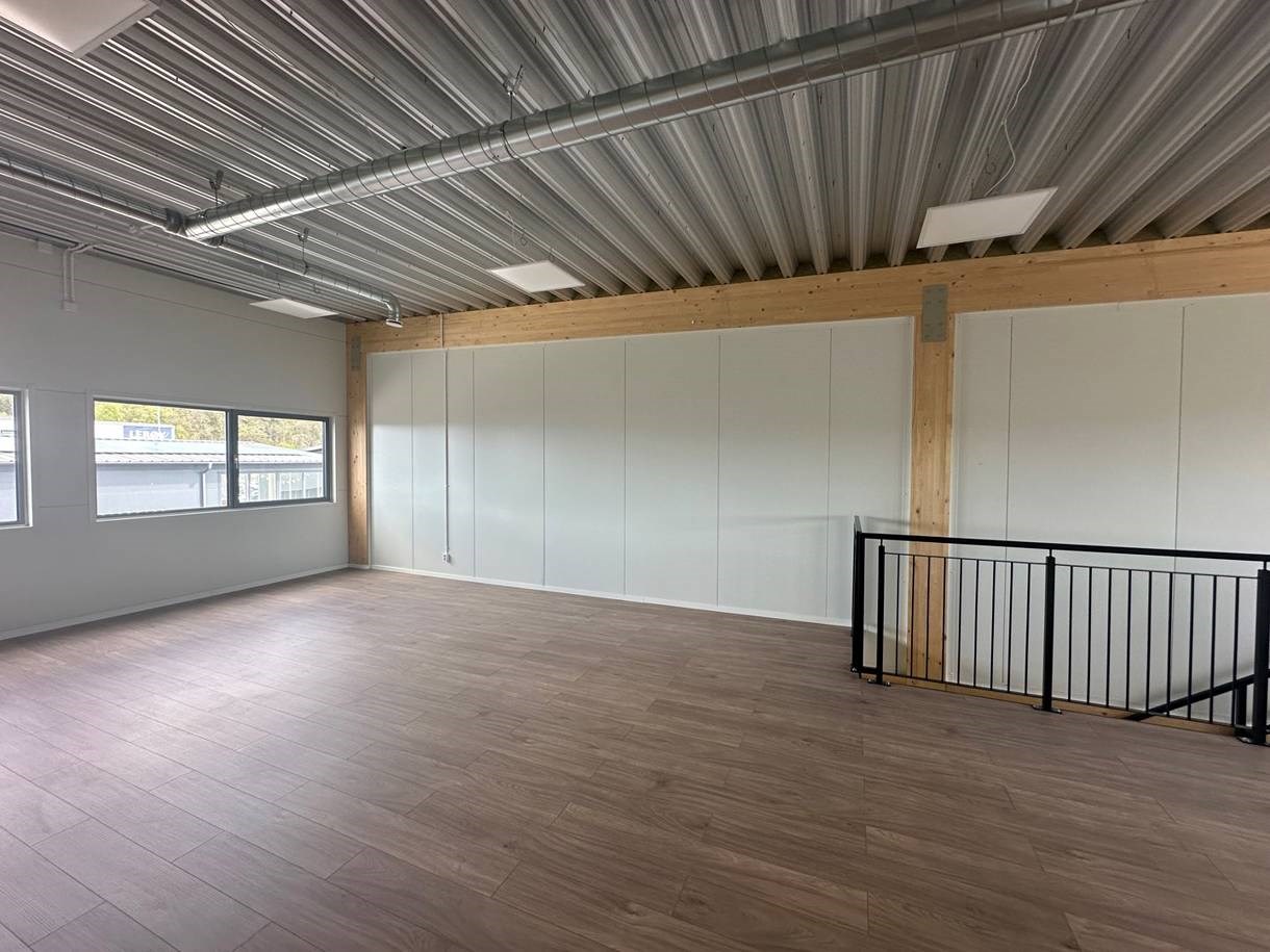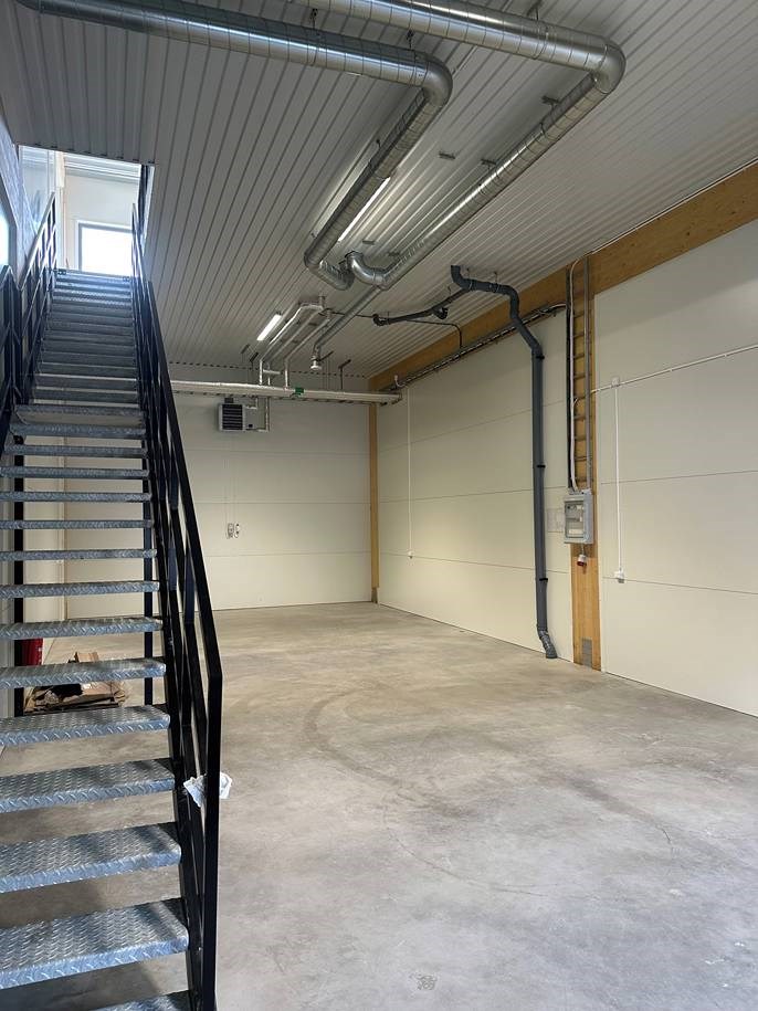 Lokalerna har en interntrappa upp till övervåningen, där ett kontor finns färdigställt för hyresgäst. I kontorsutrymmet kommer finns ett pentry samt en toalett med dusch. Kontoret erbjuds med en öppen planlösning, men går även att dela in i separata kontorsrum om så önskas.